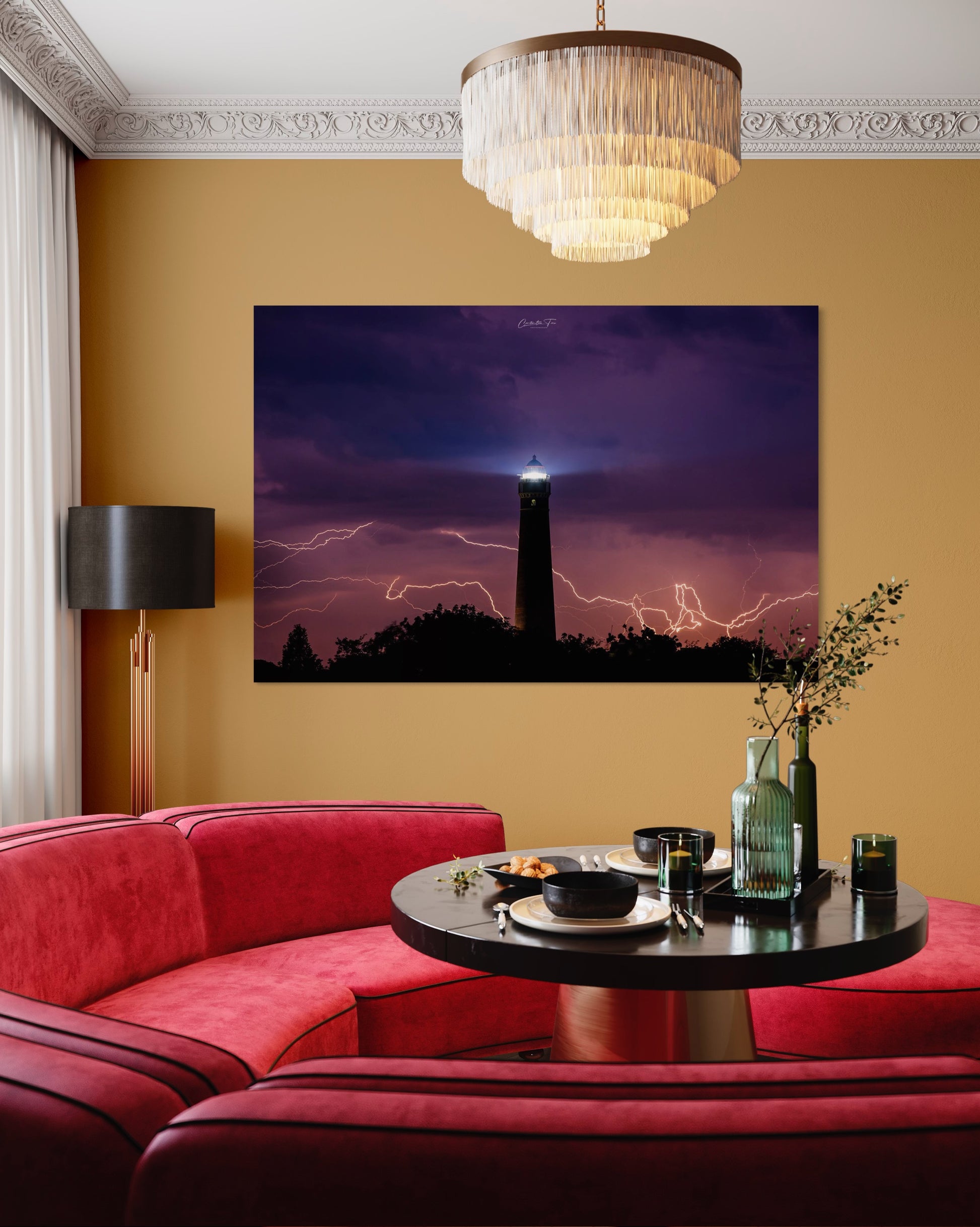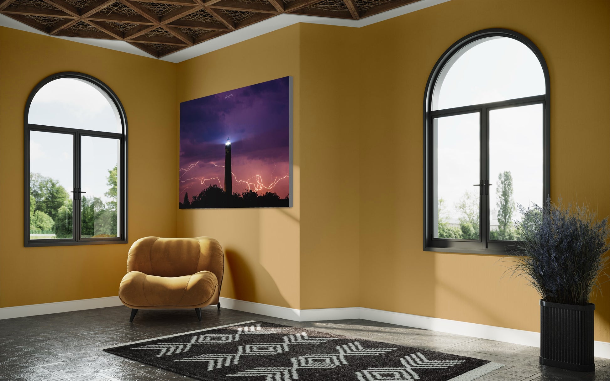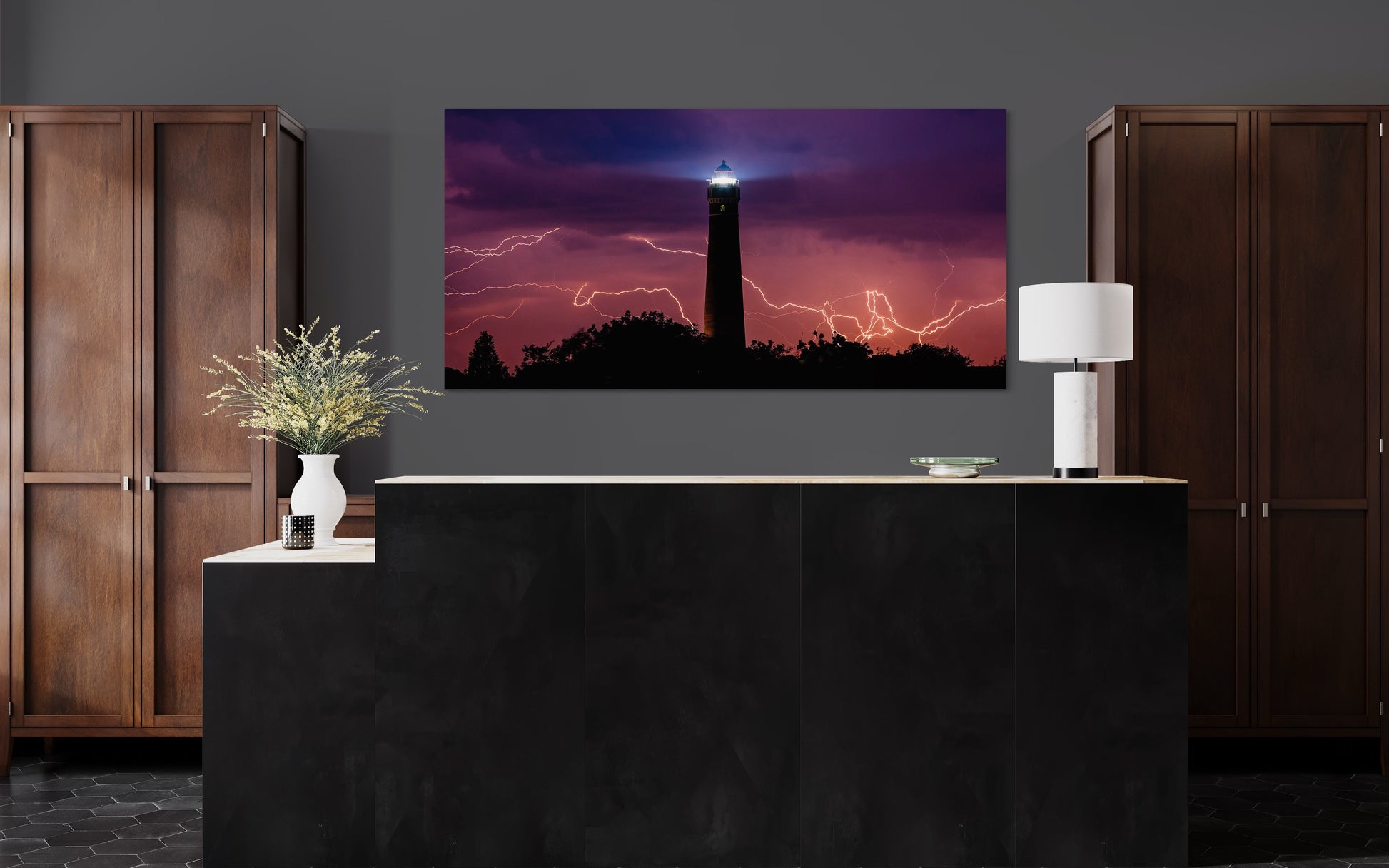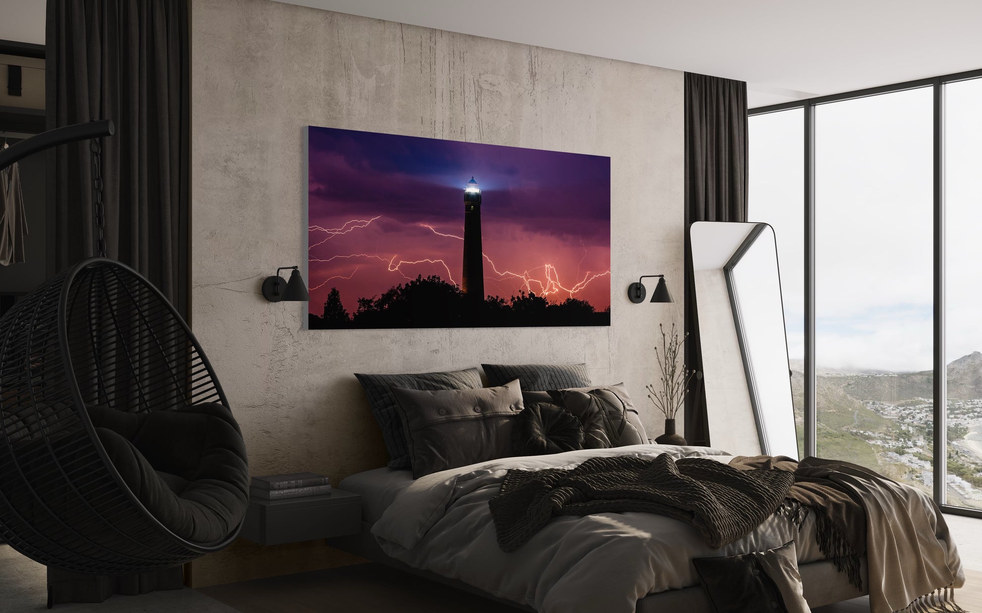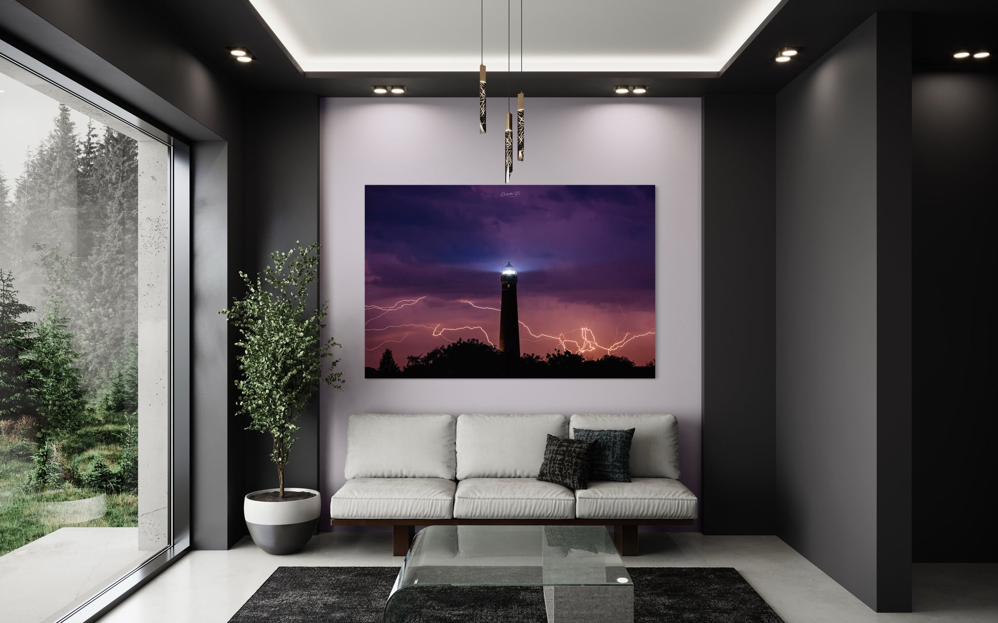 Der neue Leuchtturm mit Blitzen im Hintergrund. Das Foto wurde am 4. Juni 2019 um 23:51 Uhr von meinem Wohnzimmer aus aufgenommen, nachdem ich zwei Stunden gewartet und in dieser Nacht über 1000 Fotos gemacht hatte. Ein einzigartiger und emotionaler Moment.