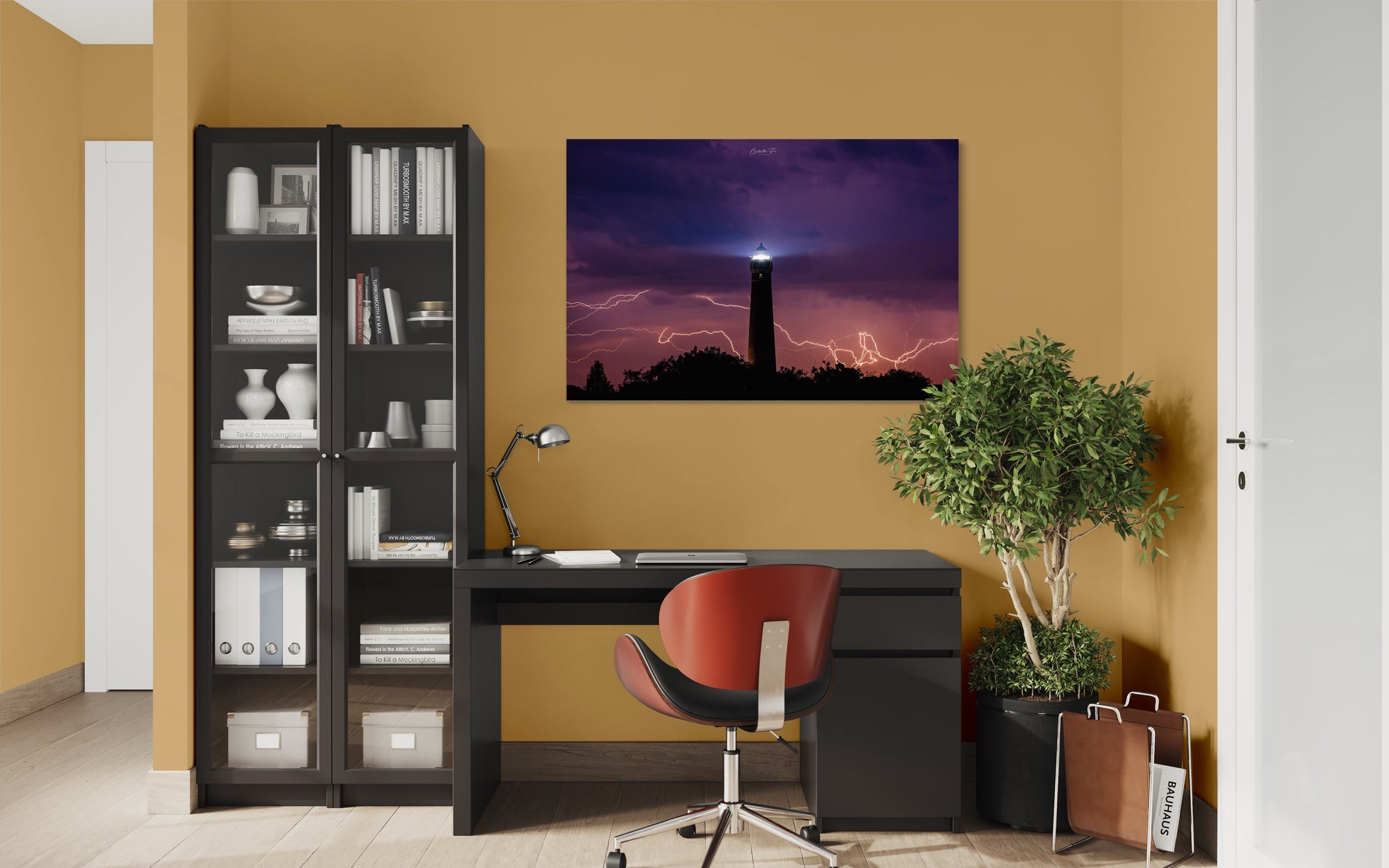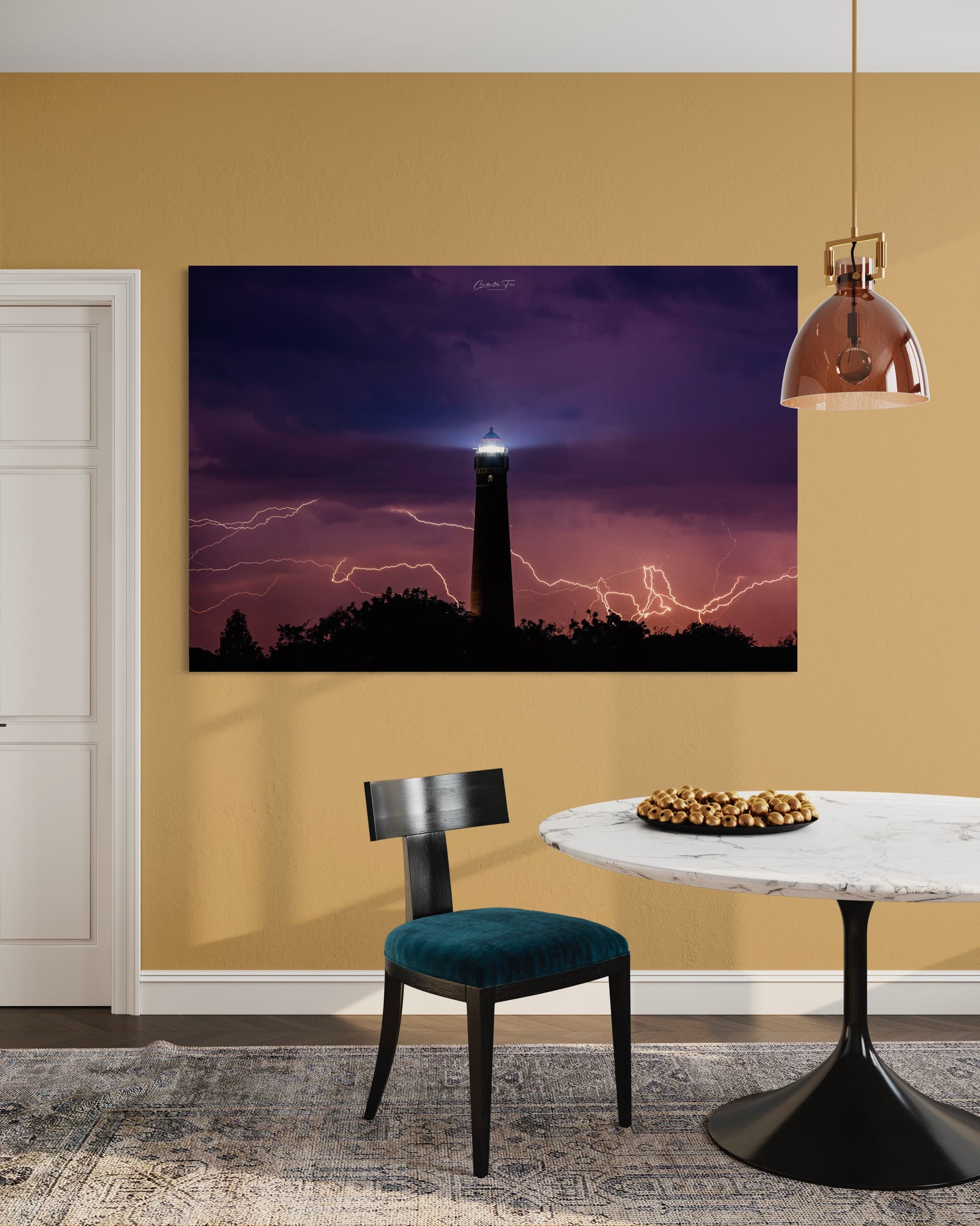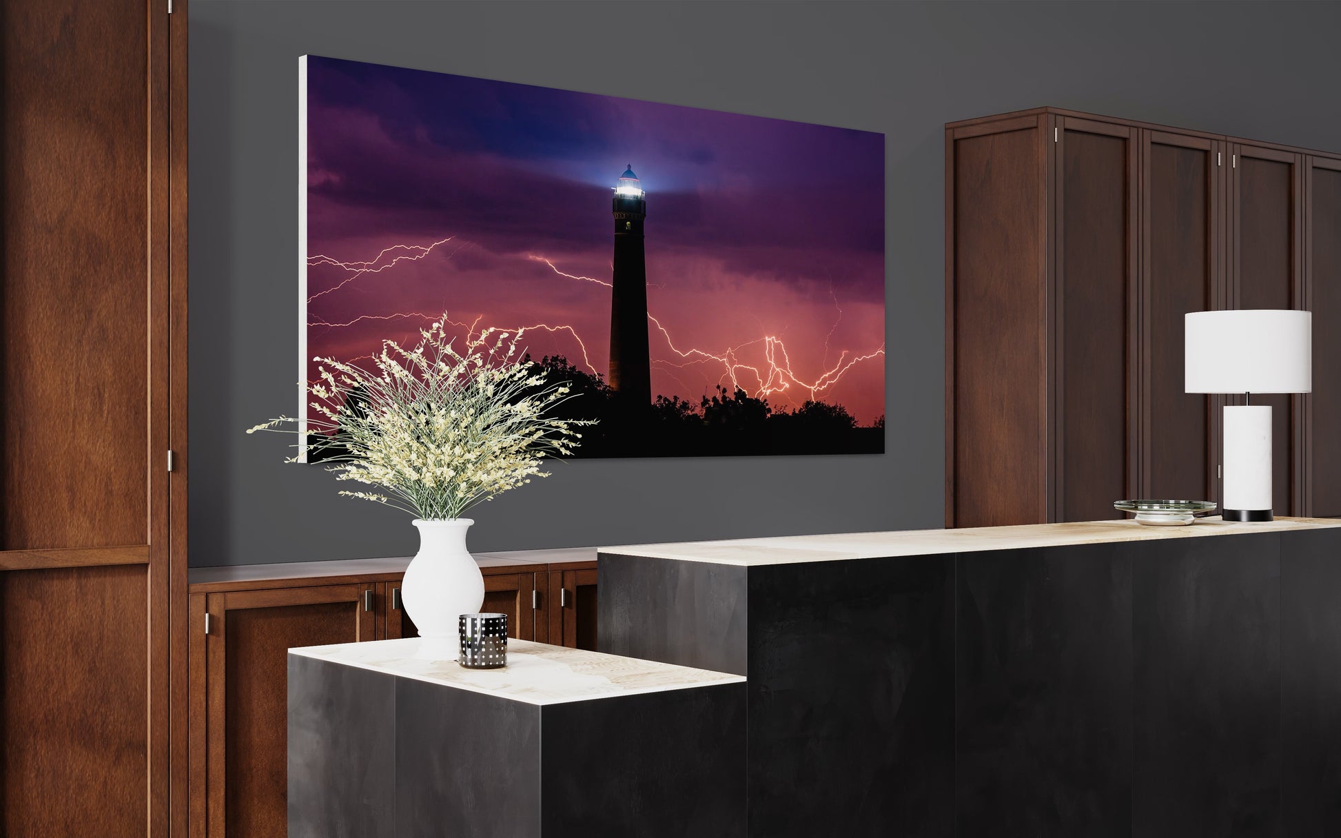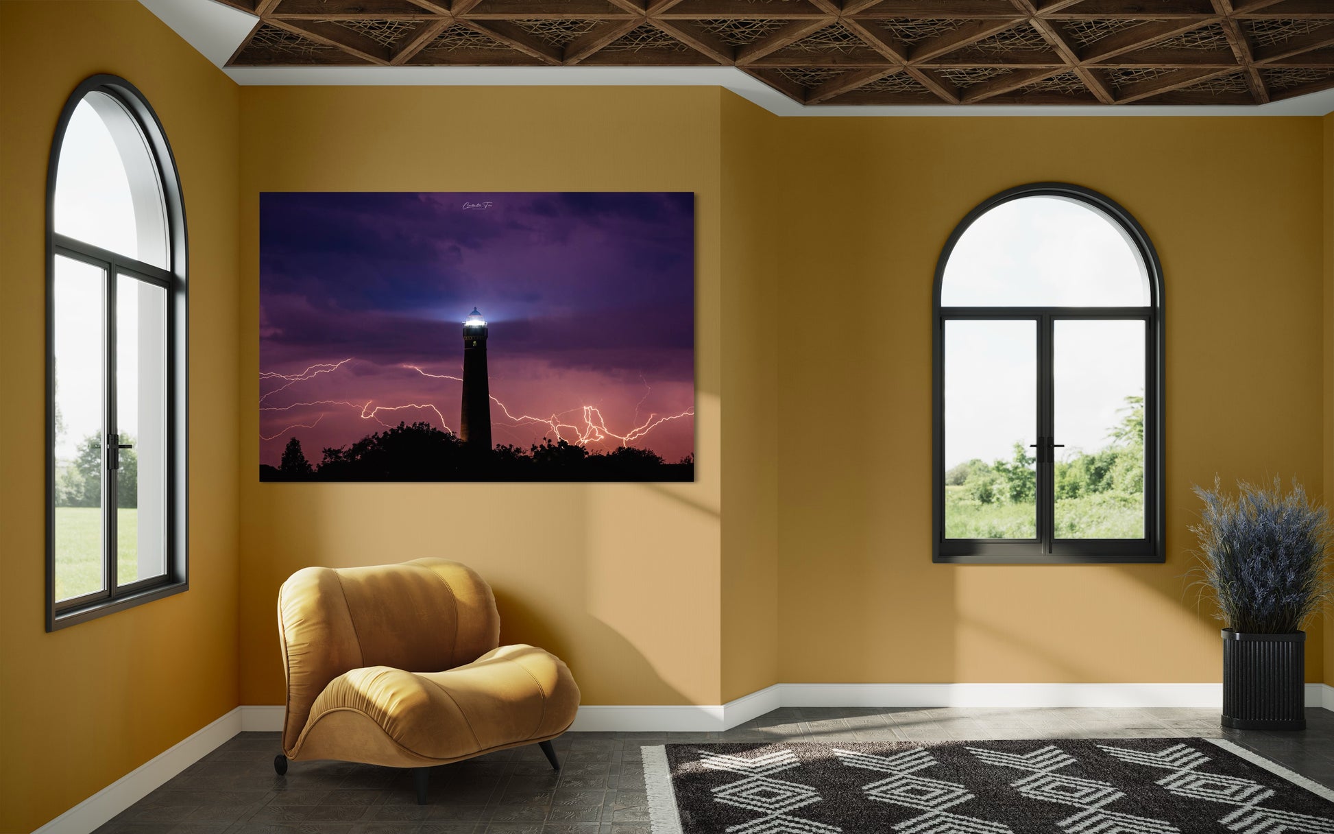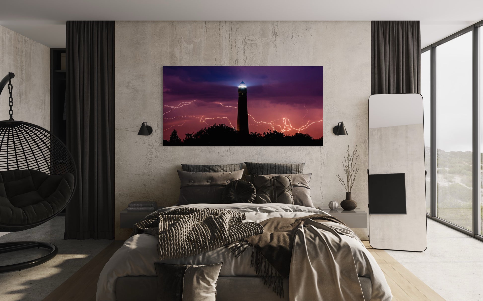 Der neue Leuchtturm mit Blitzen im Hintergrund. Das Foto wurde am 4. Juni 2019 um 23:51 Uhr von meinem Wohnzimmer aus aufgenommen, nachdem ich zwei Stunden gewartet und in dieser Nacht über 1000 Fotos gemacht hatte. Ein einzigartiger und emotionaler Moment.