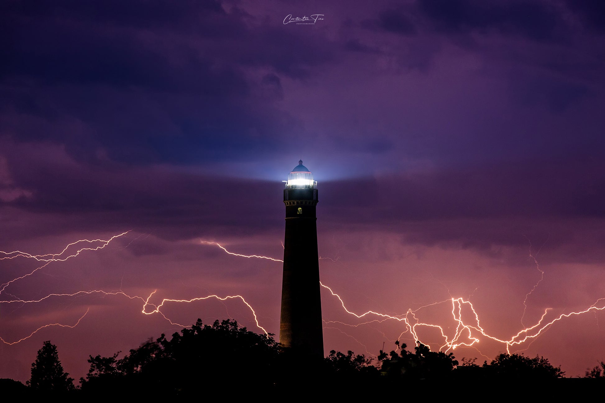 Der neue Leuchtturm mit Blitzen im Hintergrund - Insel Borkum ( 2019 )