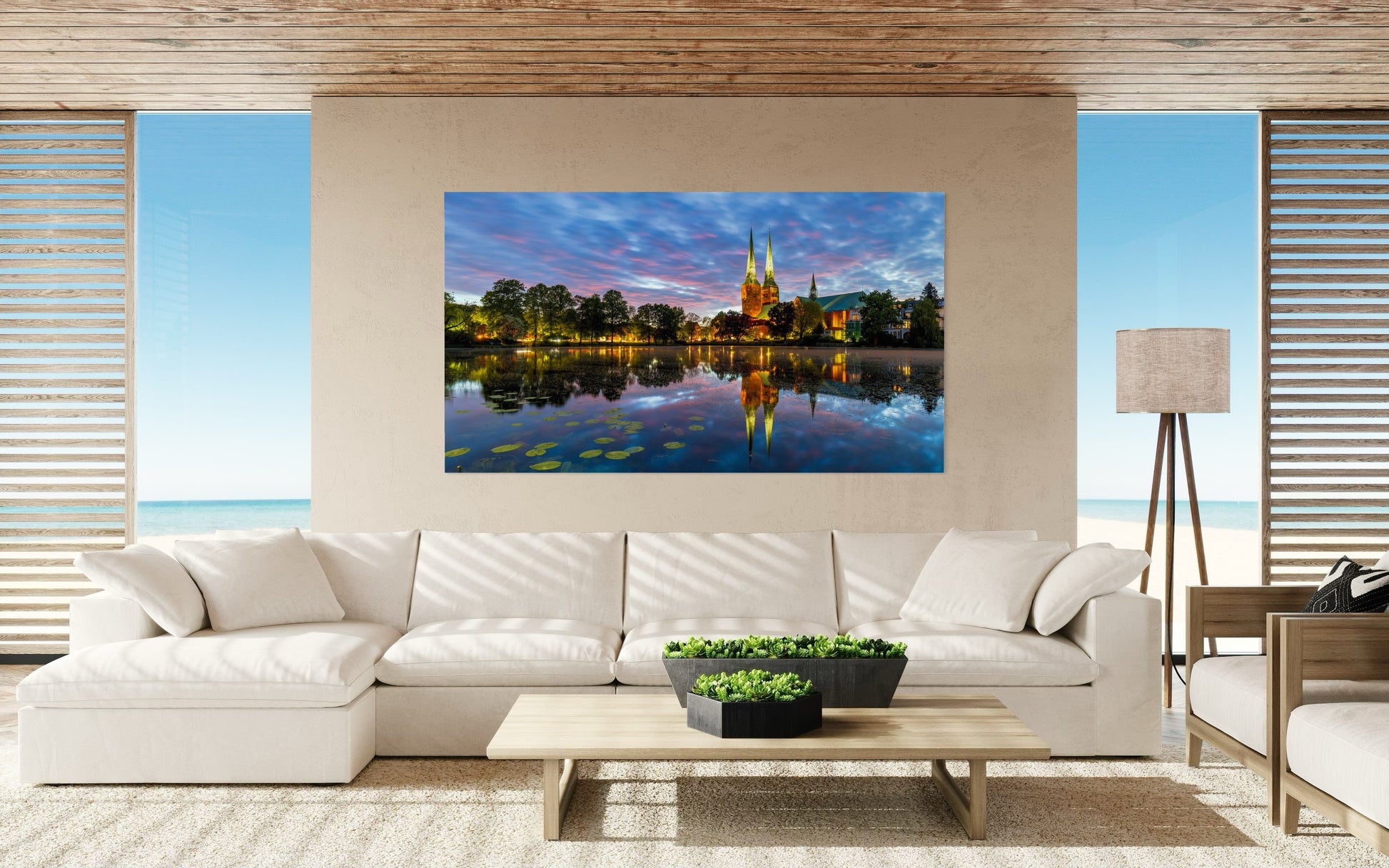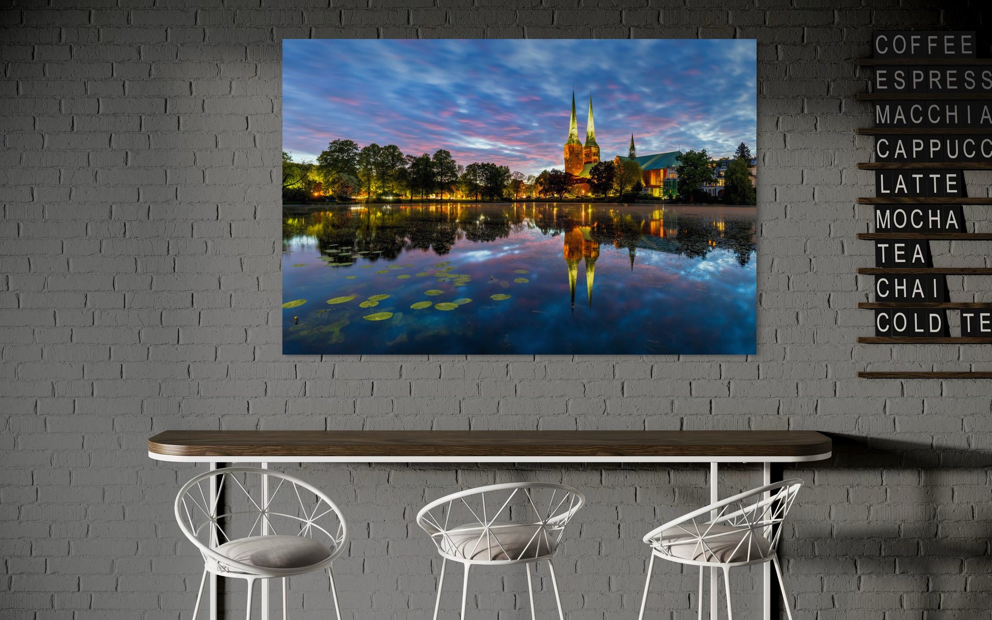 Dieses hochwertige Wandbild zeigt Lübeck in der blauen Stunde an einem ruhigen Winterabend.