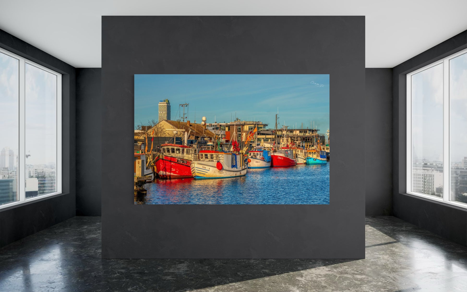 Dieses Foto fängt den authentischen Charme eines deutschen Hafens ein, in dem die Fischereitradition harmonisch mit der modernen Stadtlandschaft verschmilzt. Elegante Gebäude erheben sich im Hintergrund und bilden einen faszinierenden Kontrast zur Schlichtheit der Fischerboote.