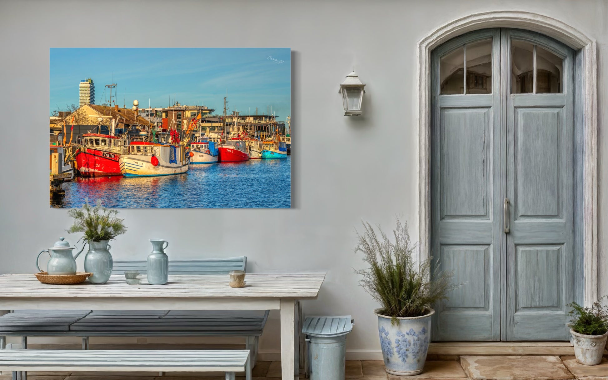 Lassen Sie Ihren Blick in diesem lebendigen Bild, das einer impressionistischen Malerei entsprungen scheint, schweifen. Fischerboote, anmutig aufgereiht, spiegeln ihre lebhaften Farben im kristallklaren Wasser des Hafens von Travemünde wider. Leuchtendes Rot, azurblaues Blau und sonniges Gelb verschmelzen zu einer farbenfrohen Symphonie und schaffen ein unvergessliches visuelles Spektakel.